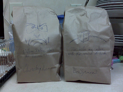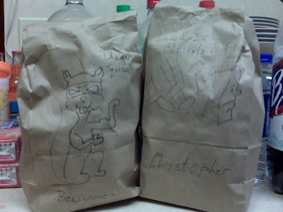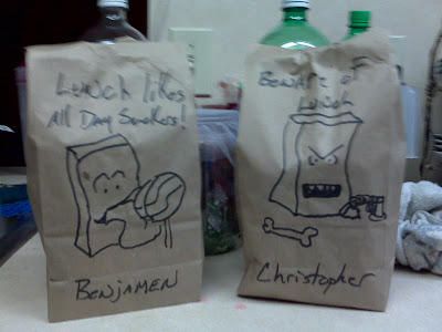 OK, so my two younger boys usually take their lunch to school and I take my lunch to work. The boys use the Brown-Paper-Bag method of transportation, so to spice up their lives THE WIFE suggested I draw on the bags to give them some character. Since the oldest boy is griping about me whining on my blog about Microsoft (and I like to have pictures and video on here anyway), I decided to include pictures of some of the bags.