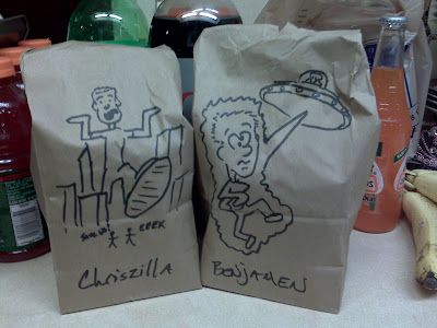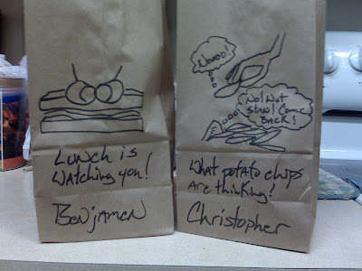 OK, so my two younger boys usually take their lunch to school and I take my lunch to work. The boys use the Brown-Paper-Bag method of transportation, so to spice up their lives THE WIFE suggested I draw on the bags to give them some character. Since the oldest boy is griping about me whining on my blog about Microsoft (and I like to have pictures and video on here anyway), I decided to include pictures of some of the bags.