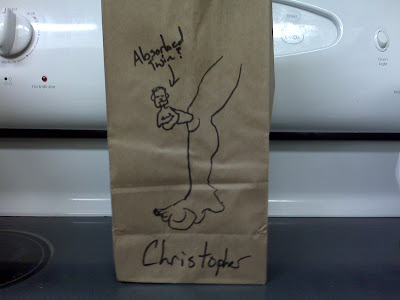 Anyway, due to requests from the kids, I am resuming "Lunchbag Artwork." Here are today's masterpieces: