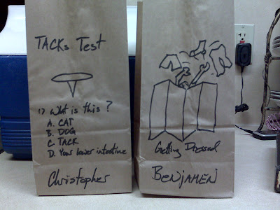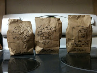 Anyway, due to requests from the kids, I am resuming "Lunchbag Artwork." Here are today's masterpieces:
